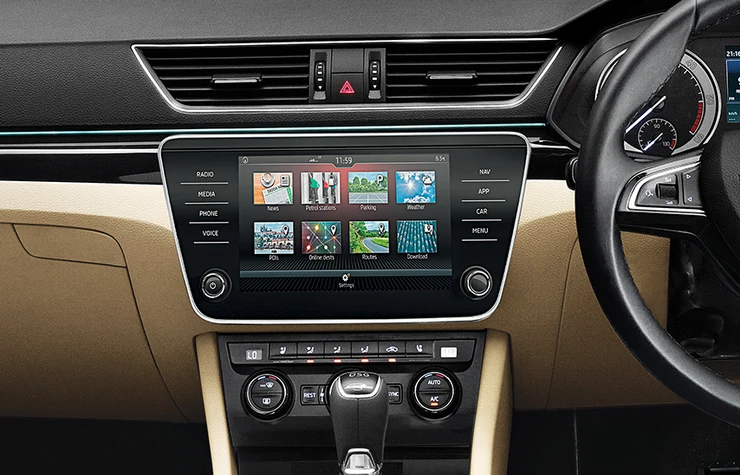 Superb flaunts an interior where we’ve thought of everything- You’re in for a treat! With a virtual Cockpit for a stylish and premium look and an electric sunroof for enjoying a view of the stars wherever you go, travelling first class with comfort is a prerogative. It also comes with Wireless Charger for hassle-free charging and a 360 view for total safety.